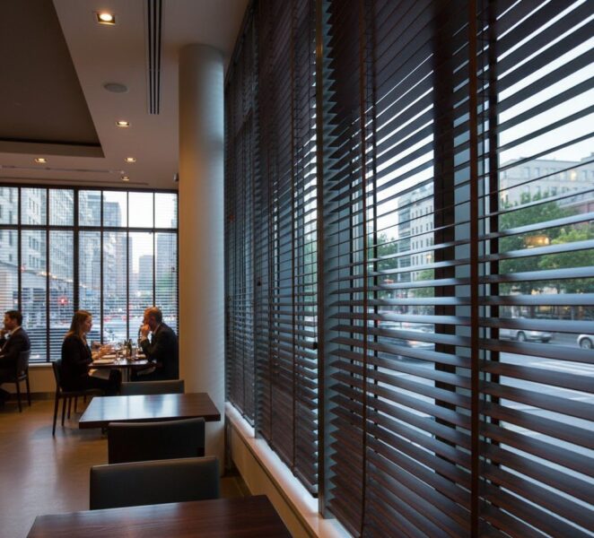 Ahşap jaluzi perdeler, restoran ve kafelerde sıcak ve davetkar bir atmosfer oluşturur. Doğal ahşap tonları, bu mekanlarda samimi ve rahat bir ortam yaratır. Ayrıca, ahşap jaluzilerin şıklığı, restoran ve kafelerin dekorasyonunu tamamlar.